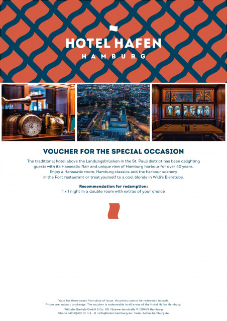 Whether it's a birthday, anniversary or a special occasion. With our value voucher, you offer your loved ones the flexibility to choose their favourite time of travel and preferred extras. Give the gift of unique maritime moments at the Hamburg harbour - with the stylish classic rooms of the Hotel Hafen Hamburg. Enjoy the full Hamburg experience with this voucher: An overnight stay in a double room (for single or double use) with that certain extra.