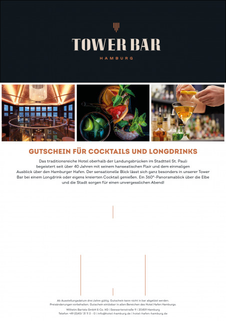 In addition to classic cocktails, self-creations and longdrinks, the Tower Bar offers a 360° panoramic view of the port of Hamburg, the Elbphilharmonie and the city itself. The presentee can enjoy cocktails or longdrinks of his or her choice.
