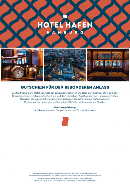 Ob Geburtstag, Jahrestag oder ein anderer besonderer Anlass. Mit unserem Wertgutschein bieten Sie Ihren Liebsten die Flexibilität, ihre Lieblingsreisezeit und die bevorzugten Extras selbst zu wählen. So verschenken Sie einzigartige hanseatische Momente am Hamburger Hafen - mit den stilvoll klassischen Zimmern des Hotel Hafen Hamburg. Mit diesem Gutschein kann das volle Hamburg-Erlebnis genossen werden: Eine Übernachtung in einem Doppelzimmer (zur Einzel- oder Doppelnutzung) mit dem gewissen Extra.